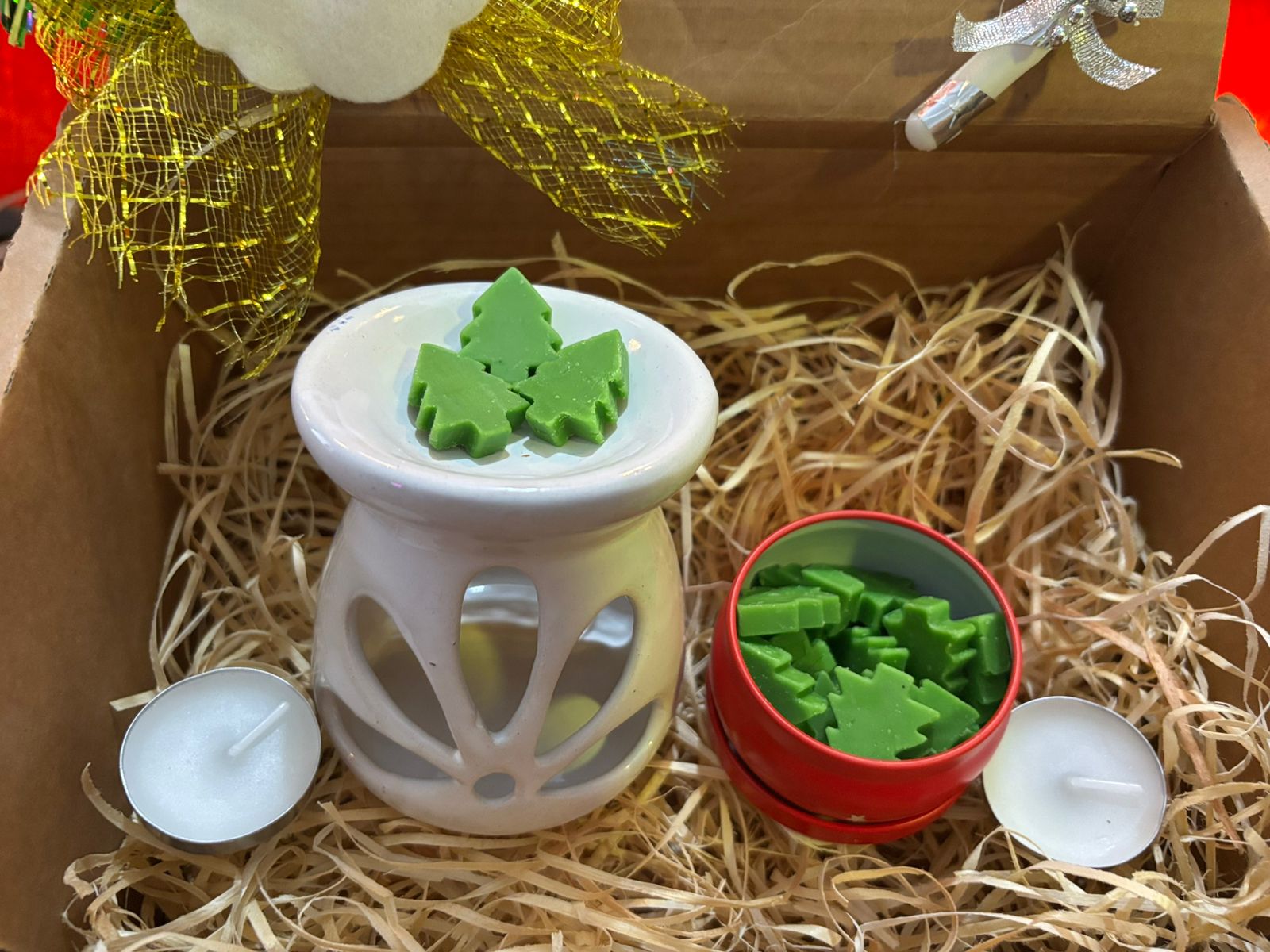 Com wax melts de Pinheirinho em lata decorada, rechaud e duas velinhas, espalha notas herbais e amadeiradas que evocam a natureza, a paz e o aconchego das festas.